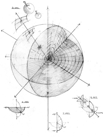 These two coordinates are sufficient to place the Synapse anywhere on a symbolic hemisphere, roughly corresponding to a view of the celestial dome from a fixed point. The third coordinate describes the proportional distance between the viewer, or point of origin and that dome. The Z-axis like the others is a dualistic axis and thus can have a negative value, which in this spatial model implies the hidden anti-hemisphere, or the anti-dome beneath the feet of the viewer - the Dark Side of the Moon, as it were.